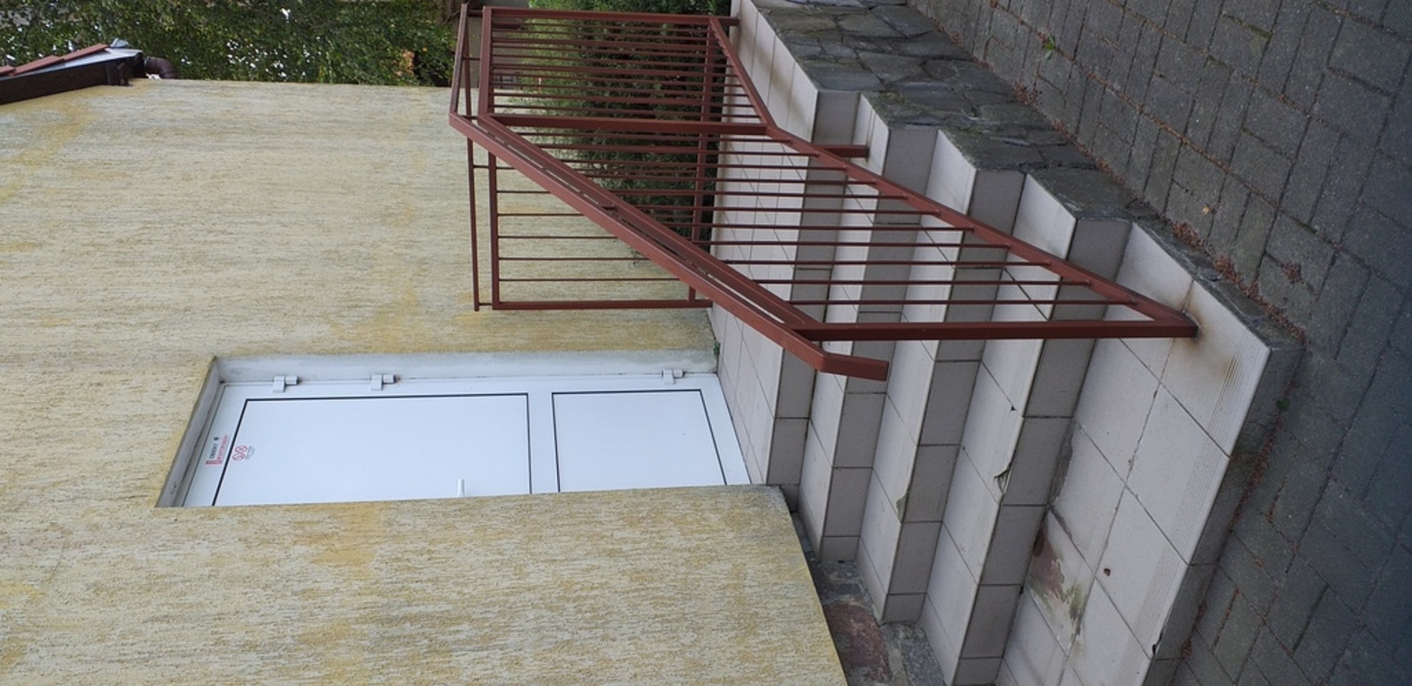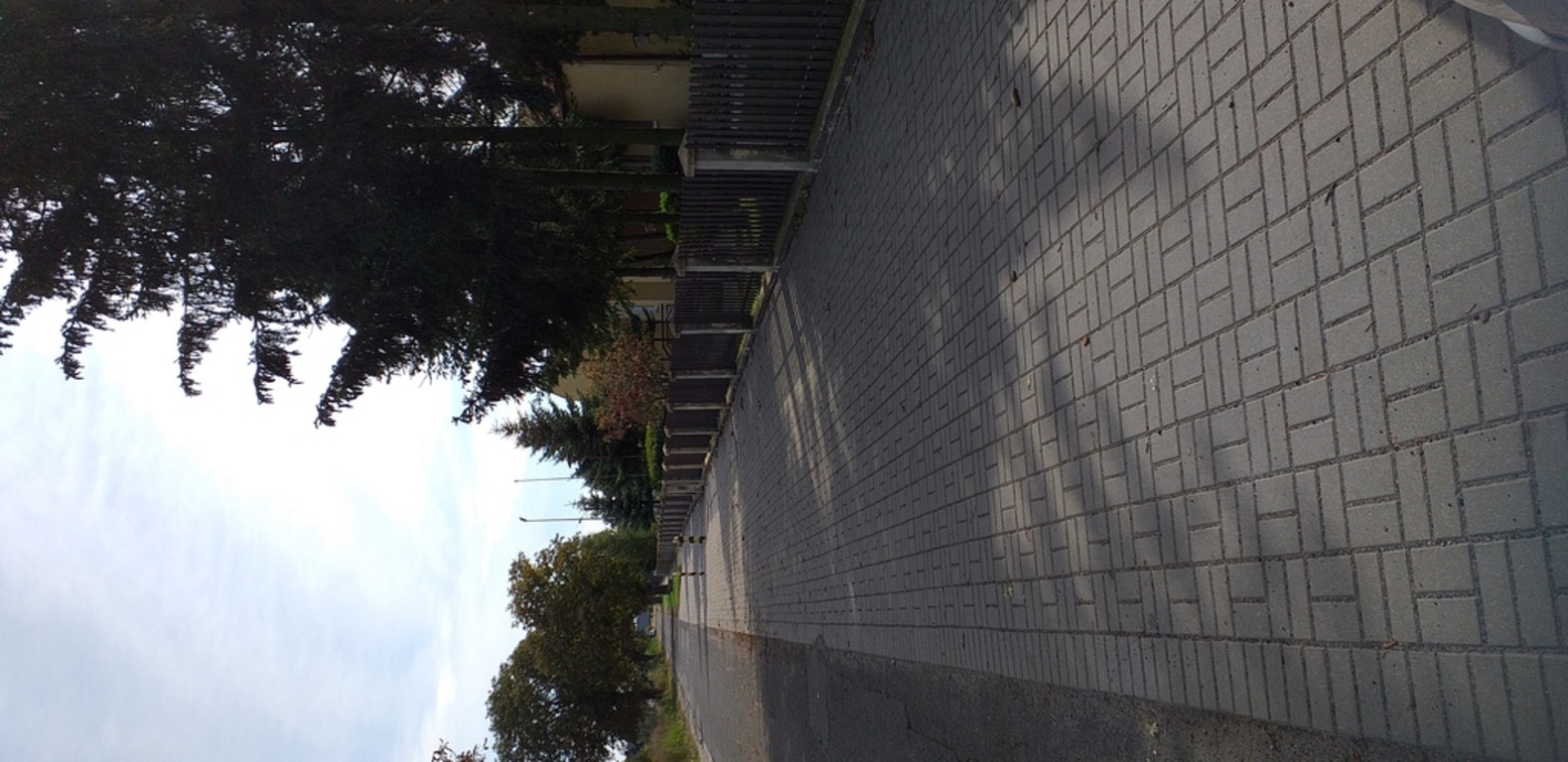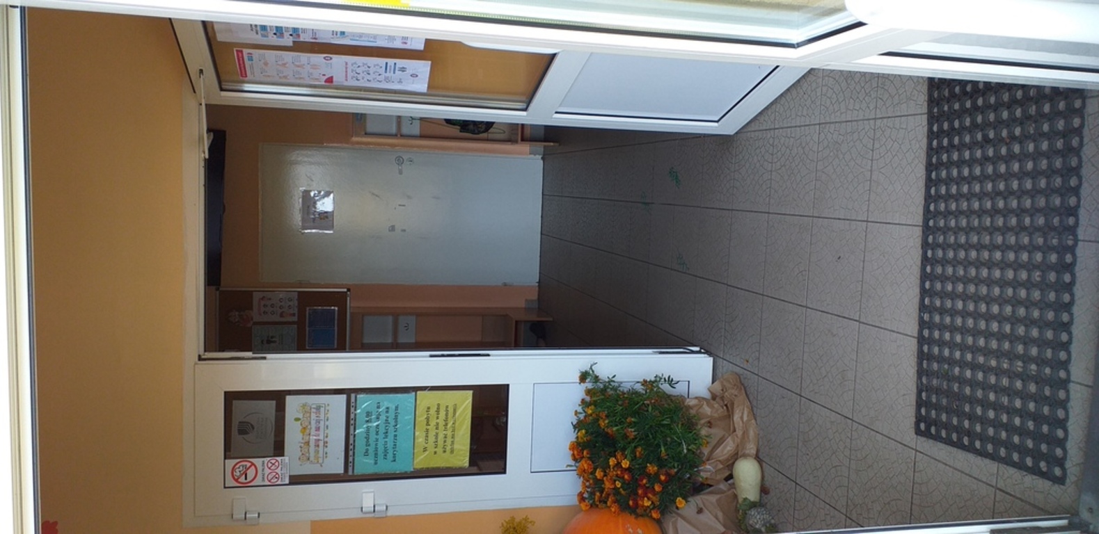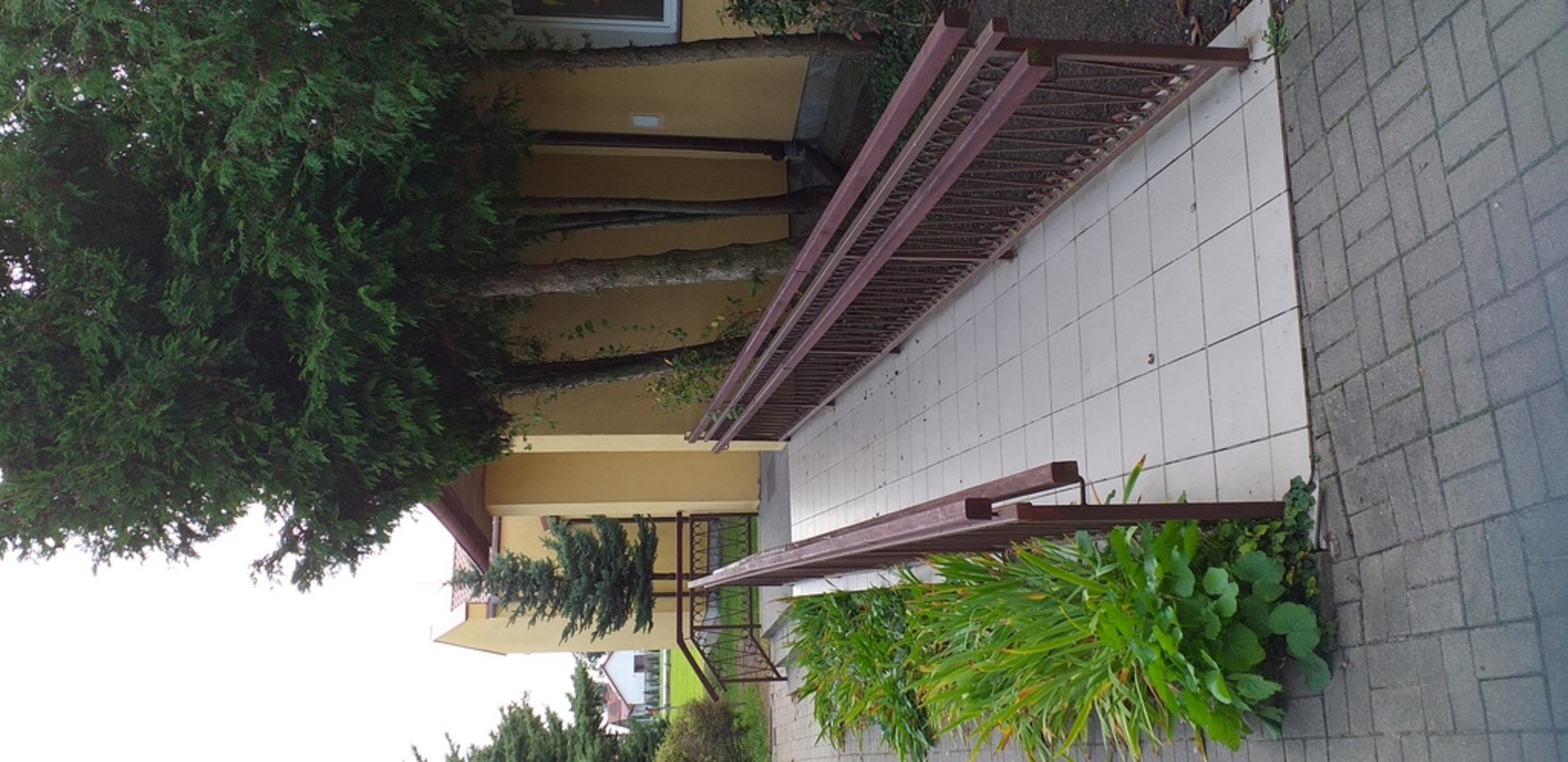 Pochylnia dostosowana dla osób niepełnosprawnych. Znajduje się przy głównym wejściu z posadzką pokrytą płytkami ceramicznymi oraz drewnianymi poręczami po obu jej stronach.