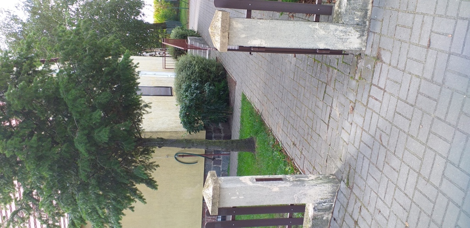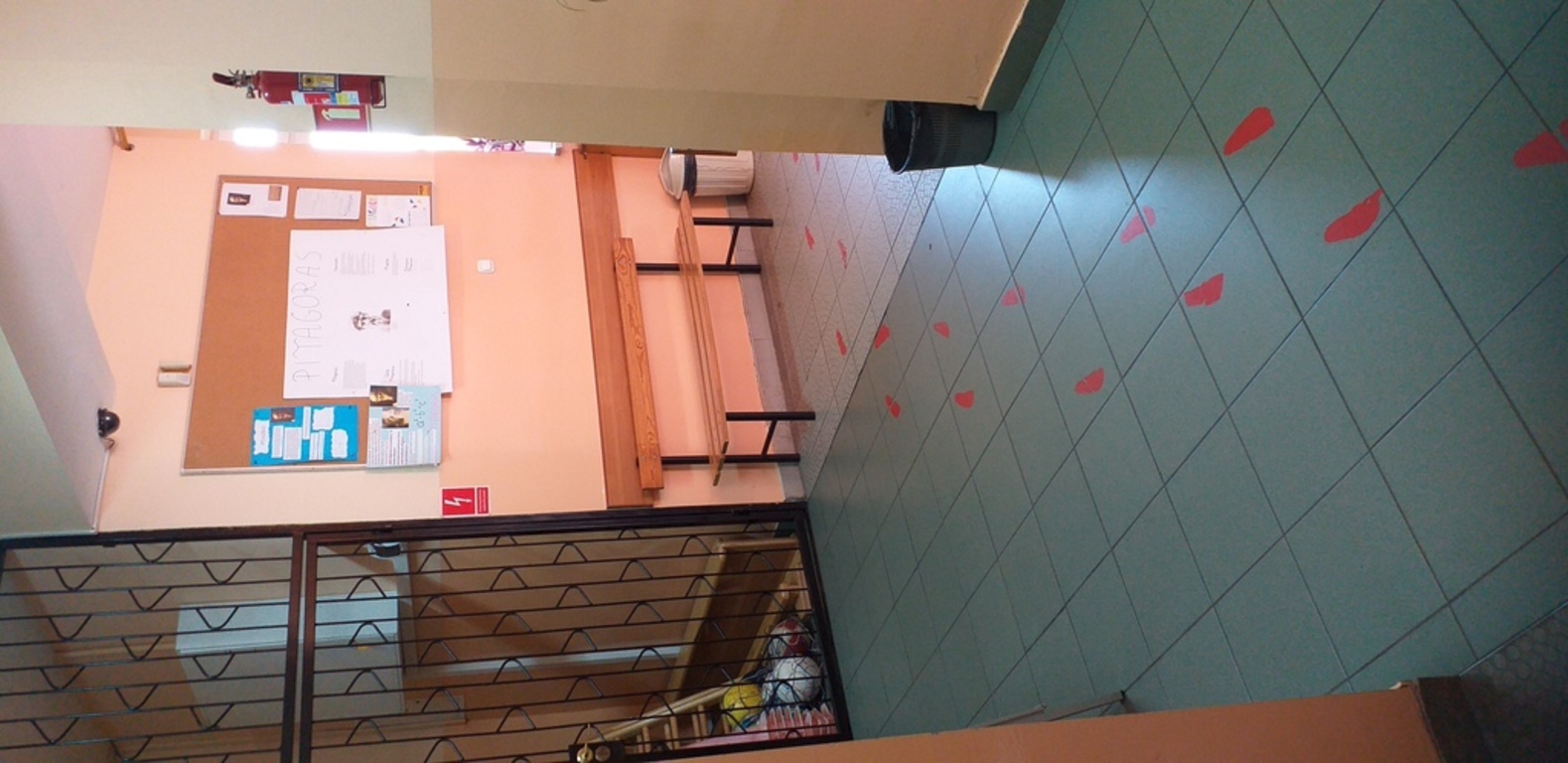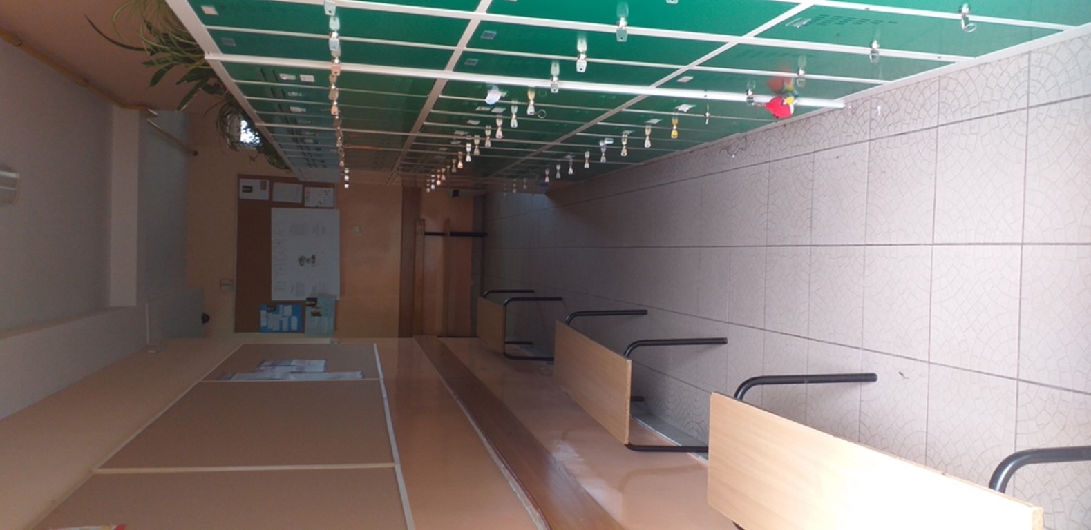 Pochylnia dostosowana dla osób niepełnosprawnych. Znajduje się przy głównym wejściu z posadzką pokrytą płytkami ceramicznymi oraz drewnianymi poręczami po obu jej stronach.