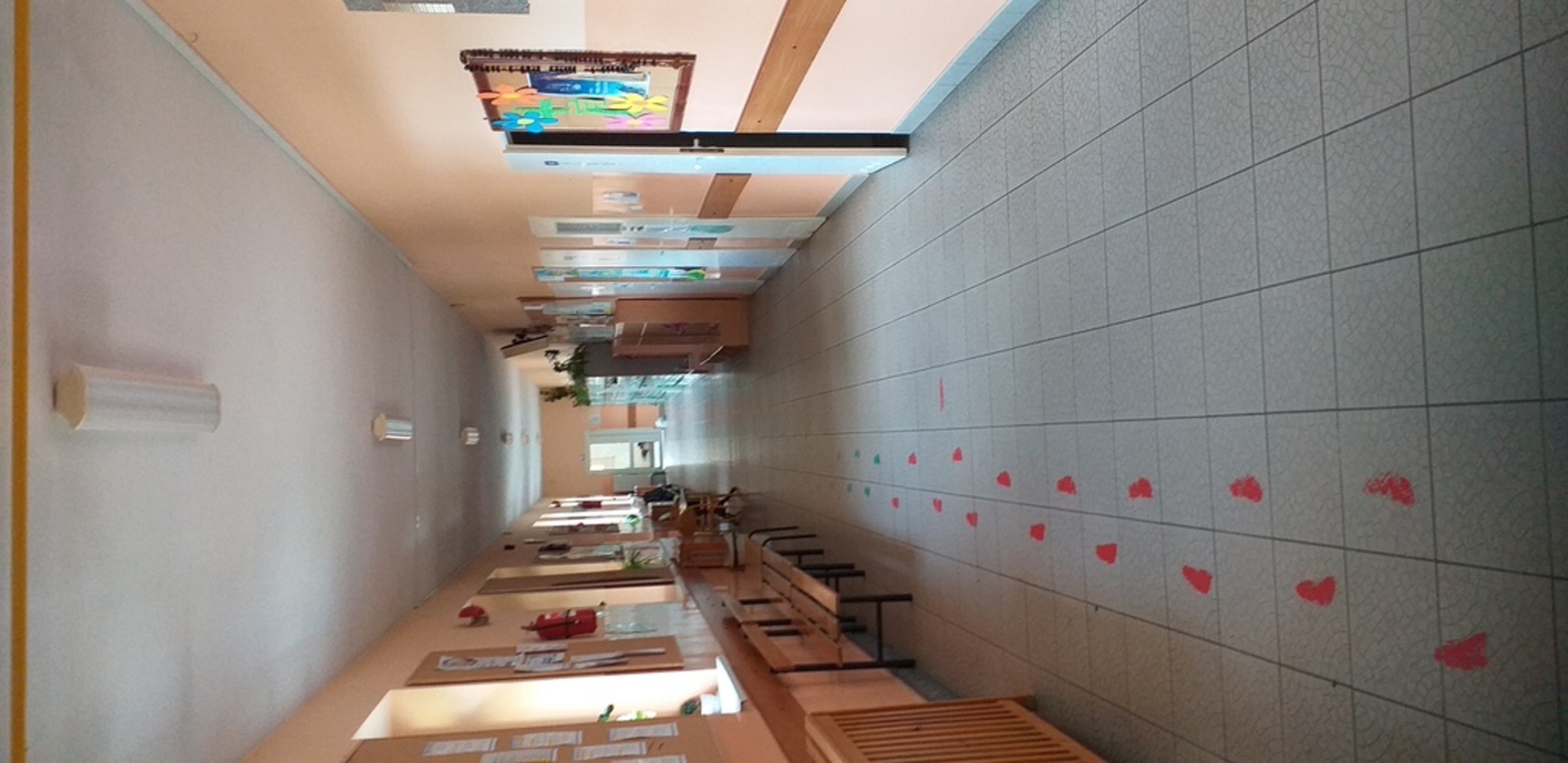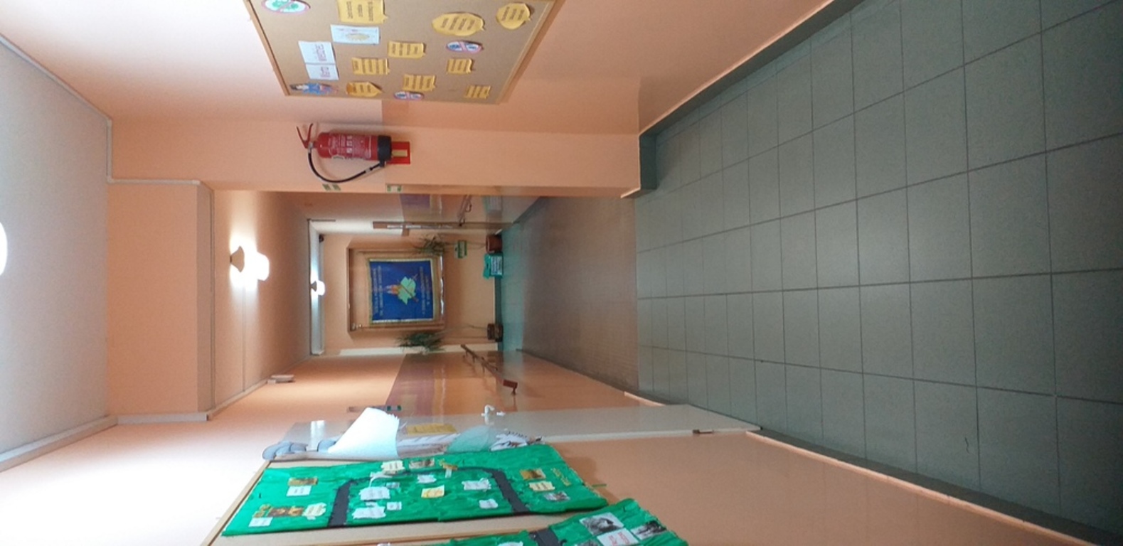 Od głównego wejścia prowadzi do korytarza wiatrołap. Za jego drzwiami znajduje się korytarz na parterze, również dla osób poruszających się na wózkach inwalidzkich (brak bocznych poręczy, z wyjątkiem części korytarza prowadzącego bezpośrednio do schodów), oraz na pierwszym piętrze, do którego prowadzą drewniane schody przystosowane dla osób poruszających się samodzielnie. Od wejścia tylnego (naprzeciwko pomieszczenia gospodarczego) jest poprowadzony wąski korytarz (między ścianą wewnętrzną szkoły a szafkami dla uczniów) do korytarza głównego.